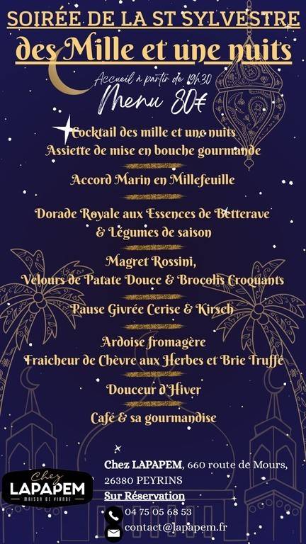 Venez fêter la nouvelle année chez Lapapem lors d'une soirée des Mille et une Nuits spécial St Sylvestre avec animation musicale par DJ Sammy et repas de fêtes !