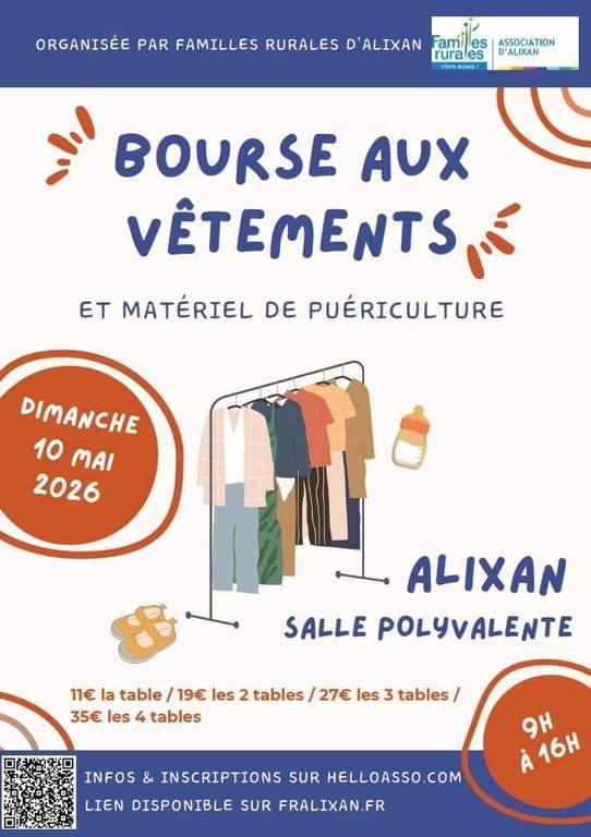 Inscription via le lien suivant : https://www.helloasso.com/associations/familles-rurales-alixan/evenements/bourse-aux-vetements-printemps-ete-2026