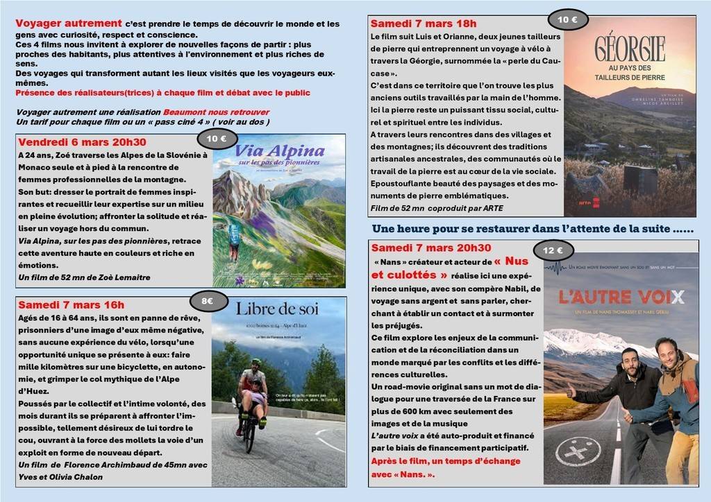 Ce Pass Ciné à tarif réduit vous donne accès aux 4 films présentés lors du Salon découverte 2026 "Voyager autrement". Le vendredi 6 mars "Via alpina" à 20h30. Le samedi 7 mars "Libre de soi" à 16H, "La route de la pierre" à 18H et "L'autre voix" à 20H30