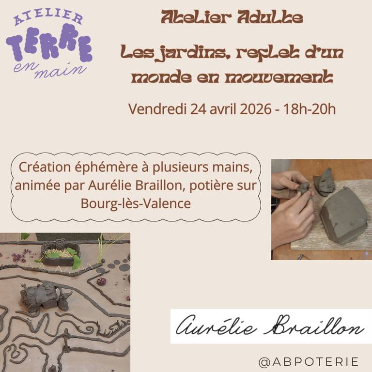 Accompagnés par Aurélie Braillon, potière, les participants sont invités à explorer librement la matière et à donner naissance à des jardins inspirés de la thématique du monde en mouvement.