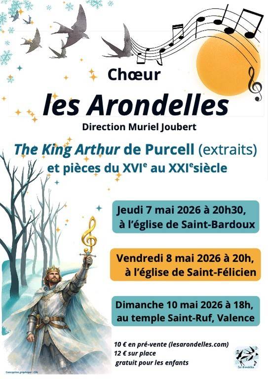 Les Chœur Les Arondelles, dirigé par Muriel Joubert, chante un programme autour d’extraits de chœurs de The King Arthur ( Purcell). Le concert entièrement a cappella proposera aussi des polyphonies de la Renaissance et des pièces récentes.