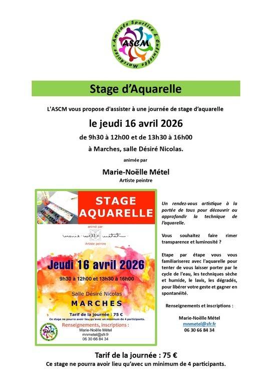 L'ASCM vous propose d'assister à un stage d’aquarelle le jeudi 16 avril 2026 de 9h30 à 12h00 et de 13h30 à 16h00 à Marches, salle Désiré Nicolas animée par Marie-Noëlle Métel, artiste peintre.
