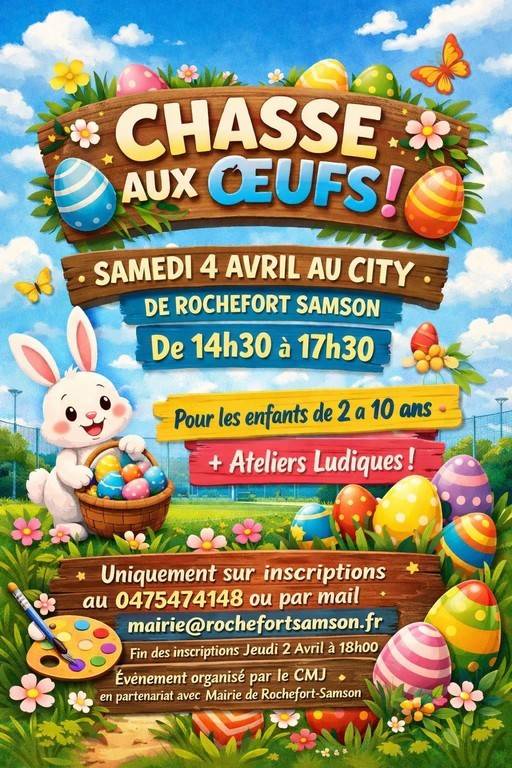 Le CMJ et la Mairie de Rochefort-Samson vous donnent rendez-vous, pour la toute première fois, à une chasse aux œufs pour les enfants du village !