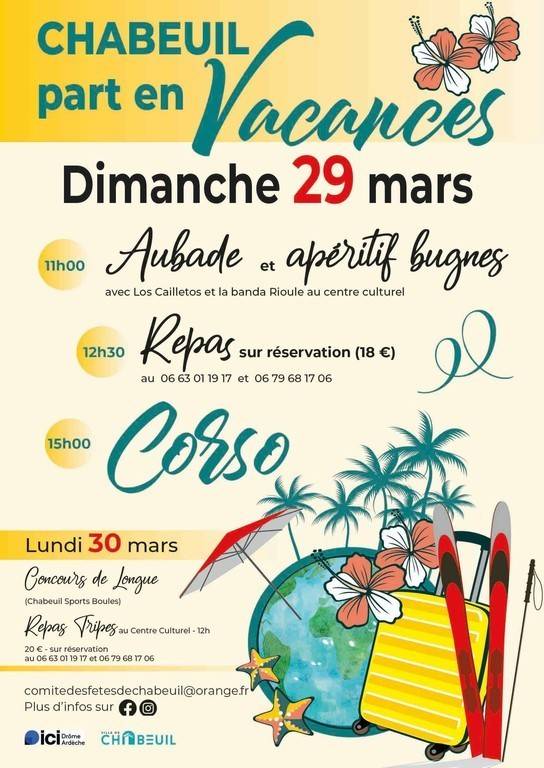 Le thème du corso sera “Chabeuil part en vacances” : plus d'une vingtaine de chars, accompagnés de trois formations musicales, des majorettes et bien d'autres surprises.