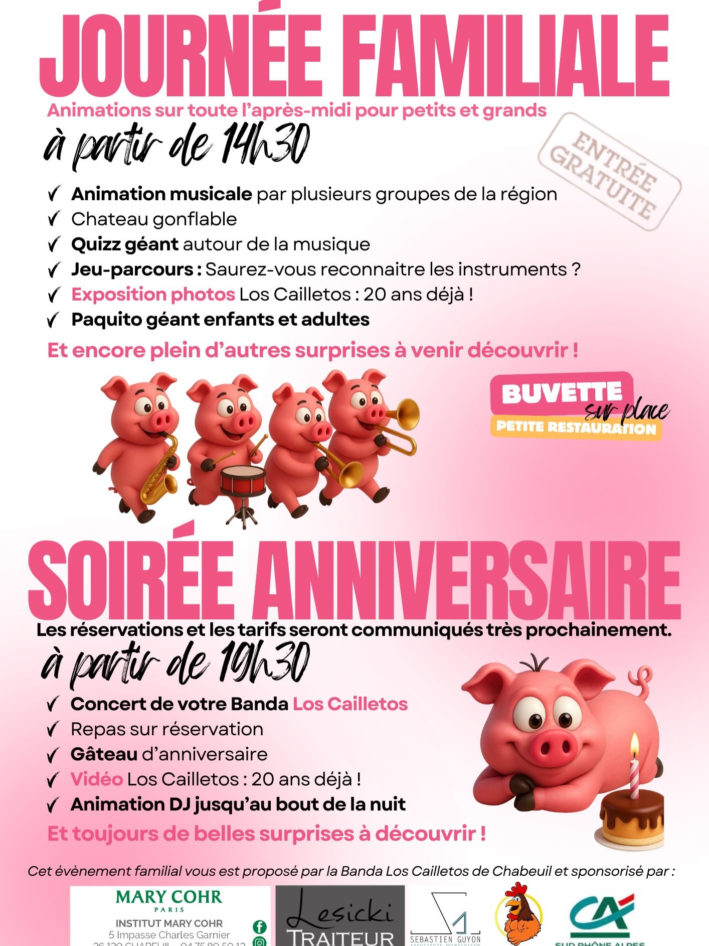 Une journée familiale pleine de bonne humeur, suivie d’une grande soirée d’anniversaire avec de nombreuses surprises au programme : animation musicale, château gonflable, paquito, quizz géant, expo...