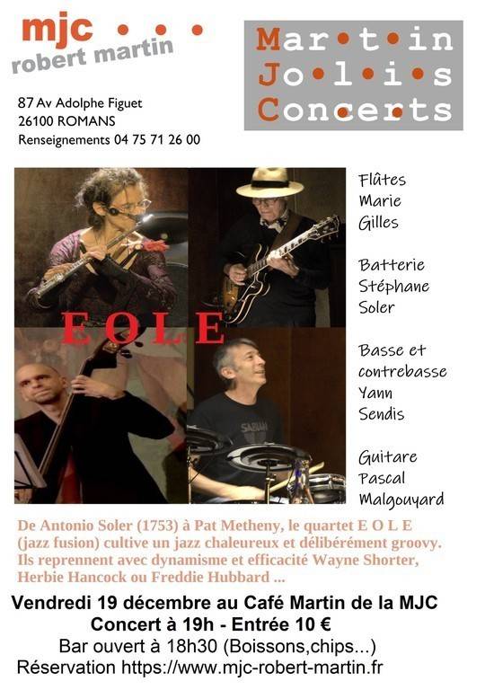 De Antonio Soler (1753) à Pat Metheny, le quartet E O L E (jazz fusion) cultive un jazz chaleureux et délibérément groovy. Ils reprennent avec dynamisme et efficacité Wayne Shorter, Herbie Hancock ou Freddie Hubbard ...