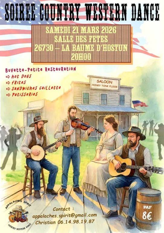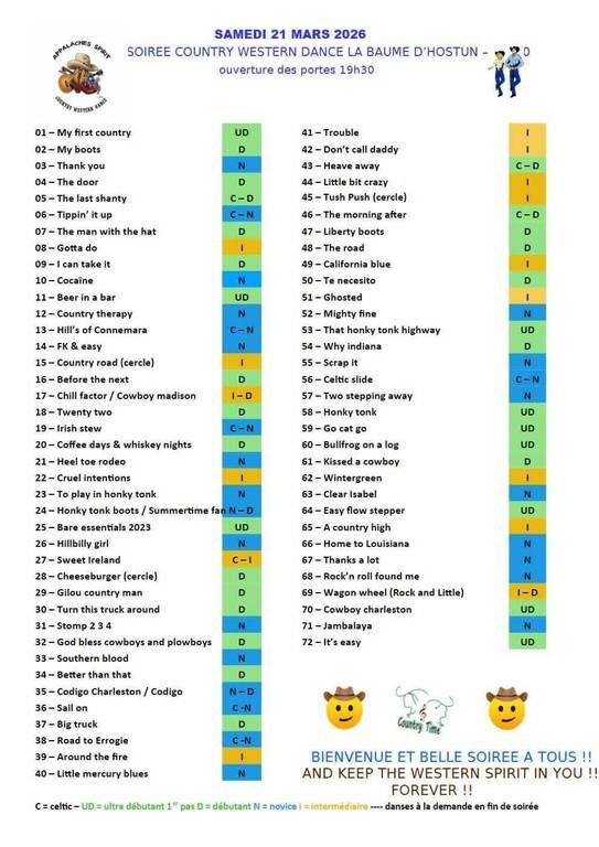 Vous trouverez en pièce jointe l'affiche et la playlist pour la soirée Country Western Dance organisée par APPALACHES SPIRIT le 21 mars 2026 !