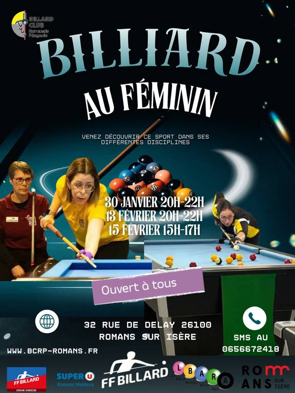 Contrairement aux idées reçues, le billard n’est pas réservé aux hommes. Pour mettre les femmes à l’honneur et leur faire découvrir cet univers passionnant, nous proposons trois temps spécialement dédiés à vous, mesdames. Venez nombreuses !