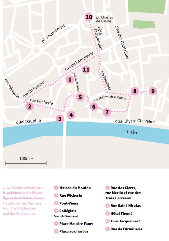 Au clocher de la collégiale Saint-Barnard au sud, cœur religieux de la cité, répond au nord celui de la tour Jacquemart, symbole du pouvoir laïc des consuls. Aux côtés de la Maison du Mouton et de l’hôtel de Clérieu, la bourgeoisie marchande et la jeune noblesse de robe se font construire d’imposants hôtels particuliers. Enfin, les rues anciennes révèlent des détails architecturaux qui témoignent de l’essor de la cité du Moyen Âge au XVIIIe siècle.