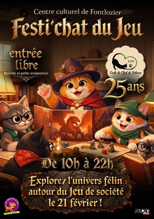 Festival de jeux de société à thème "chat" organisé par l'Ecole du Chat de Valence, pour tous les publics. Présence d'un stand des Jeux du K'Dor.