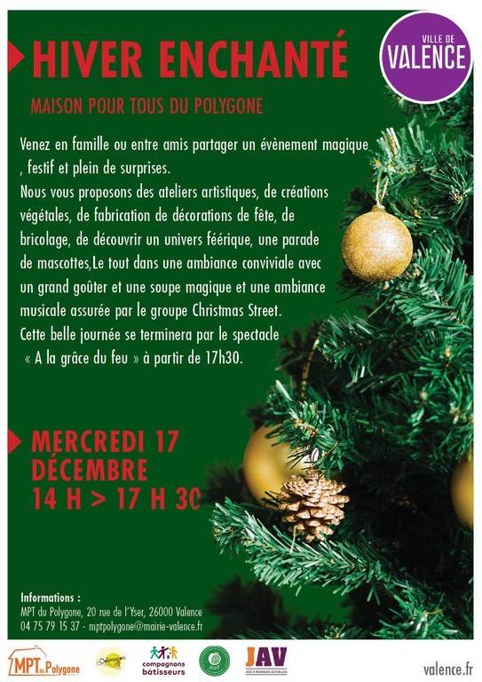 Nous vous proposons des ateliers artistiques, de créations végétales, de fabrication de décorations de fête, de bricolage, de découvrir un univers féérique, une parade de mascottes,Le tout dans une ambiance conviviale avec un grand goûter et une soupe magique et une ambiance musicale assurée par le groupe Christmas Street.