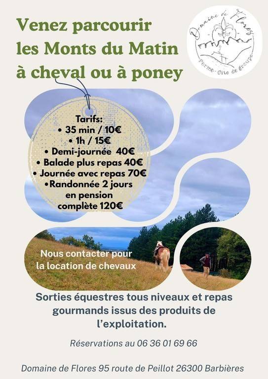 Le Domaine de Flores vous propose des balades à cheval encadrées par Agathe pour parcourir les Monts du Matin à cheval ou à poney et découvrir des paysages remarquables au pied du Vercors.